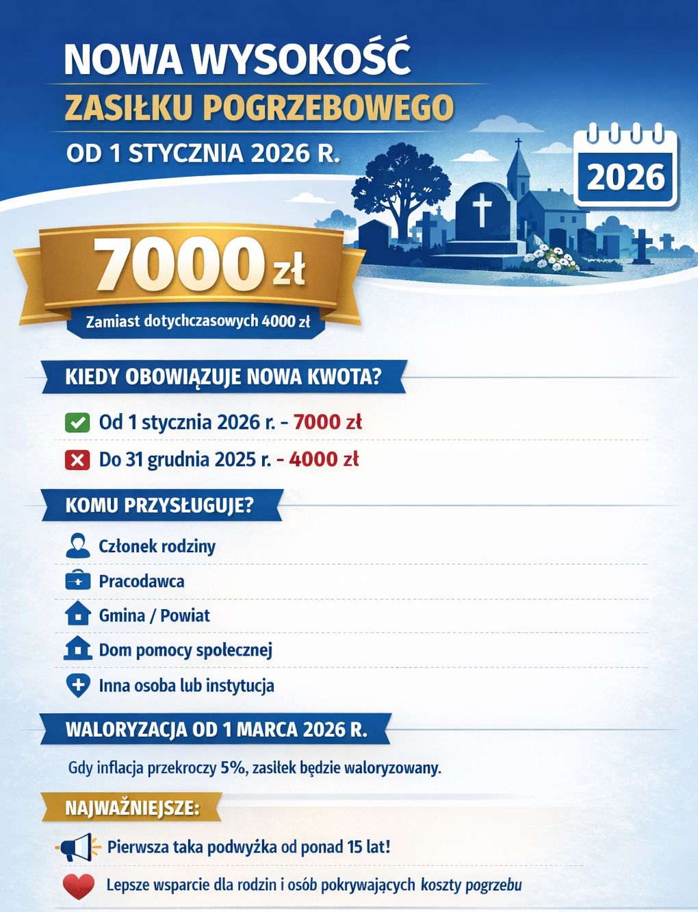 Od 1 stycznia 2026 r. zasiłek pogrzebowy będzie przysługiwał w wysokości 7.000 zł. Oznacza to, iż członek rodziny zmarłego, który pokrył koszty pogrzebu otrzyma pełną kwotę zasiłku pogrzebowego (tj. 7.000 zł).