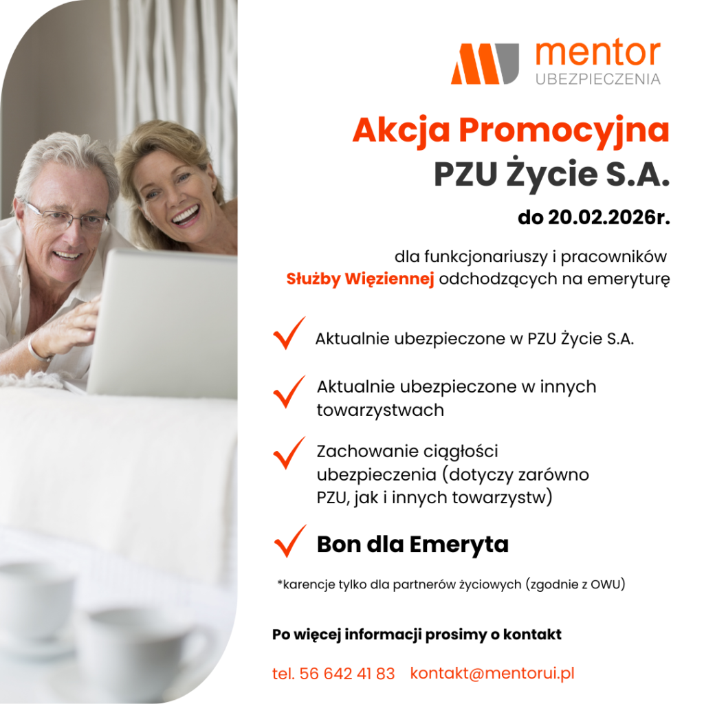 Do 20.02.2026 roku zapraszamy do specjalnej akcji promocyjnej dla funkcjonariuszy i pracowników Służby Więziennej odchodzących na emeryturę.