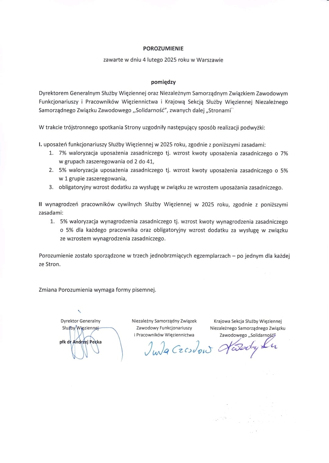 4 lutego w siedzibie Centralnego Zarządu Służby Więziennej doszło do podpisania porozumienia w sprawie waloryzacji wynagrodzeń pracowników i funkcjonariuszy Służby Więziennej.