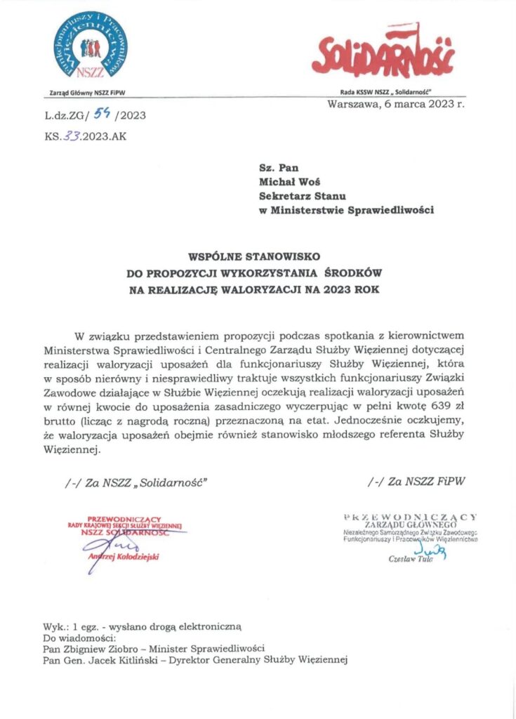 Poniżej przedstawiamy wspólne Stanowisko Związków Zawodowych działających w Służbie Więziennej Rady Krajowej Sekcji Służby Więziennej NSZZ ?Solidarność? oraz NSZZ Funkcjonariuszy i Pracowników Więziennictwa ws. waloryzacji uposażeń funkcjonariuszy Służby Więziennej na rok 2023 r.